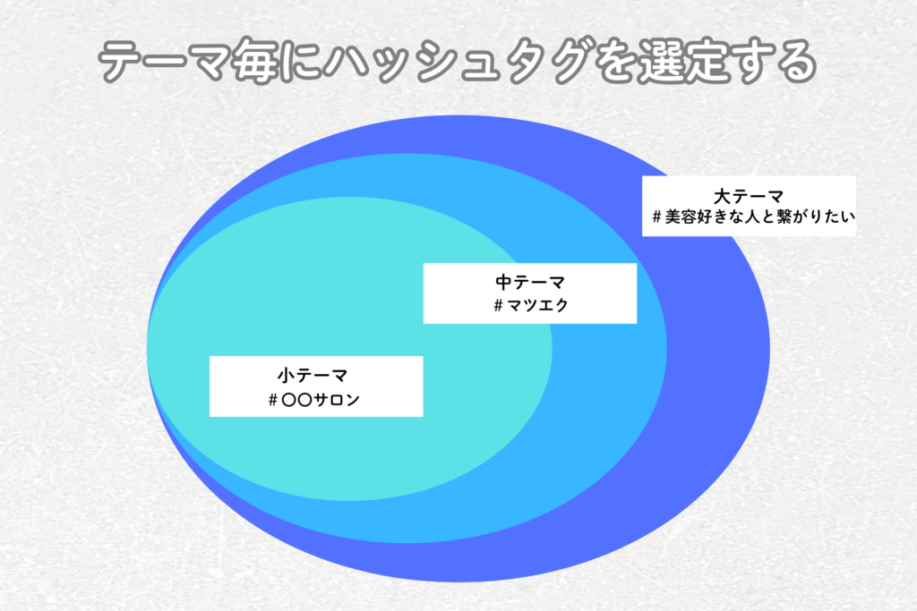 ハッシュタグ選びの基本は、大テーマから小テーマまで段階的に絞り込むことで、10個程度のハッシュタグを使用することをお勧めします。