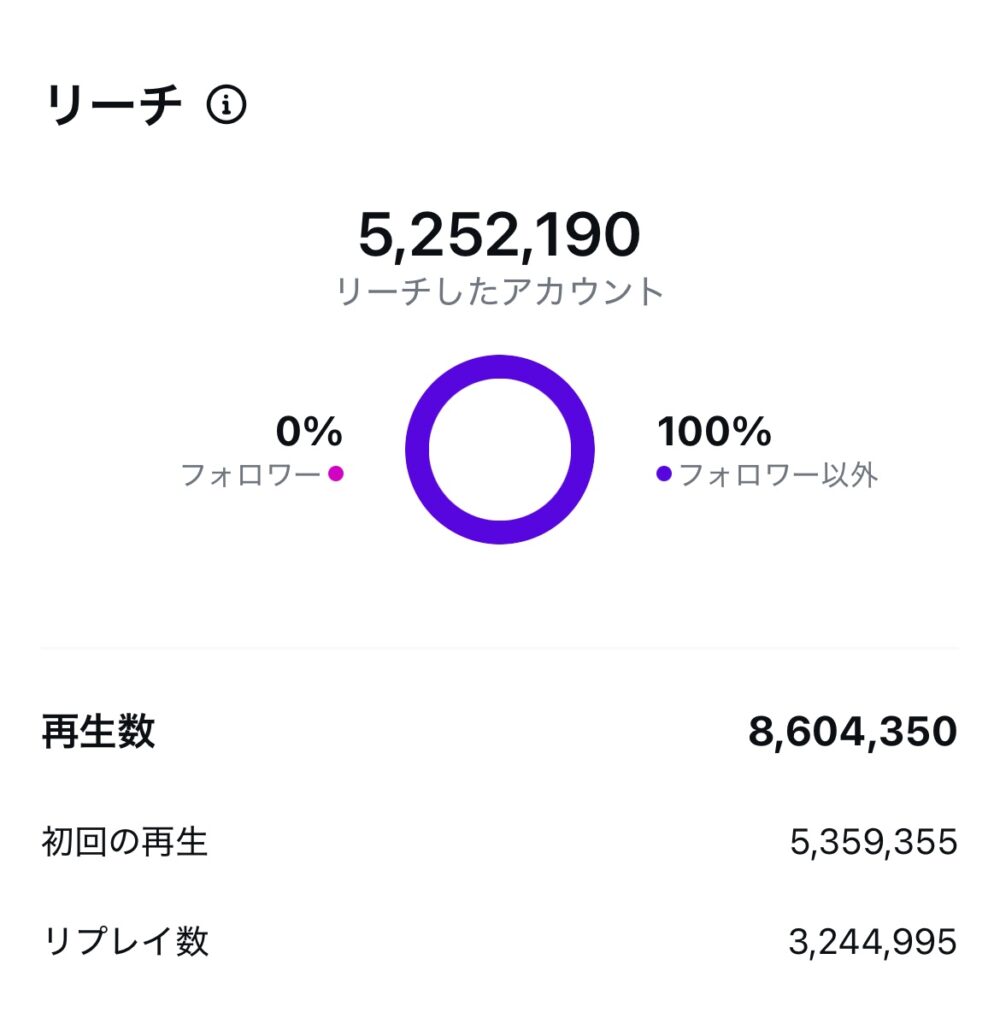 上記の画像は実際に860万再生されたショート動画のインサイト画像であり、520万人の新規アカウントに無料でアプローチすることができました。